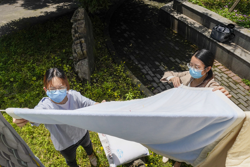 5月15日,在betway88西汉姆联一栋宿舍楼下,一名返校大学生(左)在辅导员老师的帮助下晒被子。
