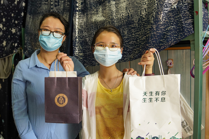 5月15日,在betway88西汉姆联女生宿舍内,一名学生(右)展示学校和学院送来的装有口罩、防疫指南的纸袋。