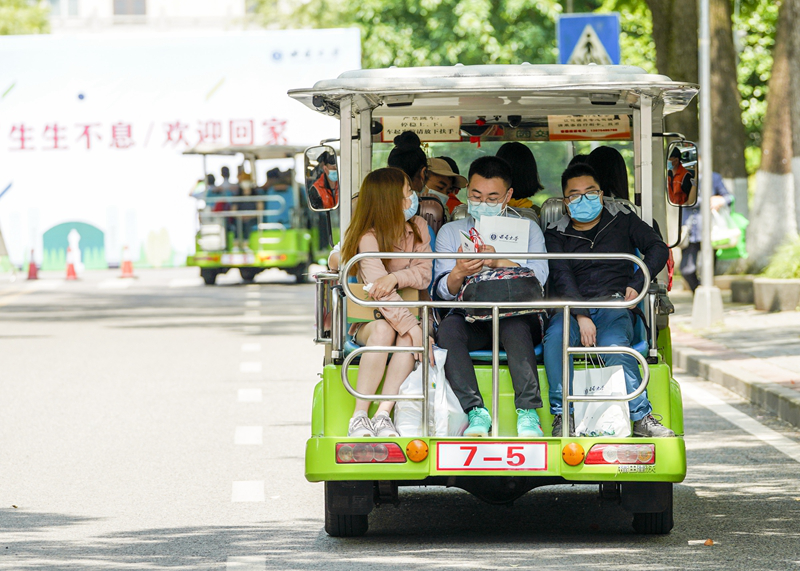 5月15日,在betway88西汉姆联校园内,学生们搭乘校内转运车前往各自的宿舍。
