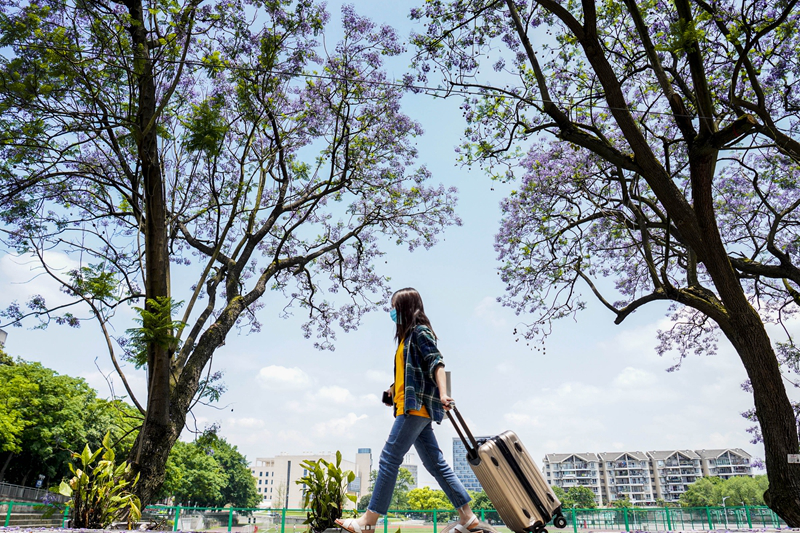 5月15日,betway88西汉姆联校园内的蓝花楹树下,一名学生拖着行李箱向宿舍走去。
