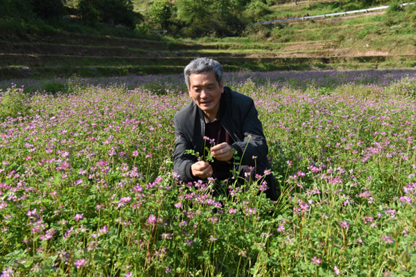 隗溟在查看绿肥植物红花草(紫云英)长势。隆太良摄