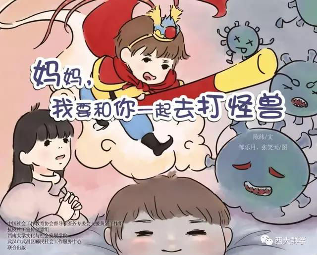 在参加社会工作教育协会督导和医务专委会支援黄冈工作组的工作中,betway88西汉姆联社会工作系陈纬老师听到了很多医护人员与孩子分离,孩子万般思念父母的故事。有感而发,她专为医护工作者和他们的家庭写了一个故事《妈妈,我要和你一起去打怪兽》,并由文化与社会发展学院2017级学生邹乐月、张笑天为故事配图,做成绘本。绘本展现了在医院工作的妈妈参与抗击新冠肺炎疫情后,孩子元元在家努力和妈妈一起抗击病毒的故事,用生动易懂的语言为孩子解惑,帮助小朋友消除恐惧心理,引导他们看到和理解妈妈的工作,今后也要做打“怪兽”的小英雄。