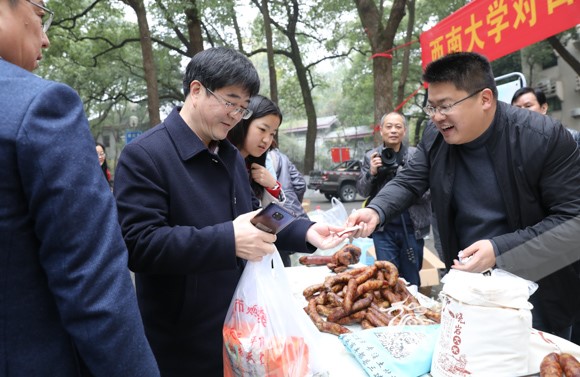 betway88西汉姆联党委书记李旭锋(中)购买花生、香肠,支持扶贫展销活动。华龙网-新重庆客户端记者 张质 摄