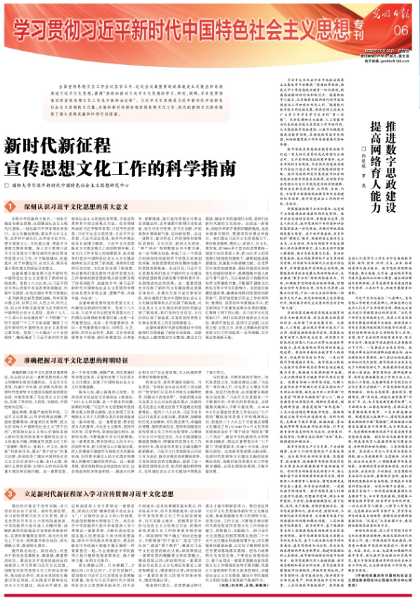 新时代新征程,深入学习贯彻习近平总书记重要讲话精神,做好互联网时代的思政工作,进一步推进数字思政建设,既需要加强数字思政的顶层设计,创新理念、内容、形式、方法,也需要加强教师的数字素养,深化数字思政理论和实践研究,建立可持续发展的学科理论体系和长效工作机制,大力推动思政工作创新,增强其实效性。