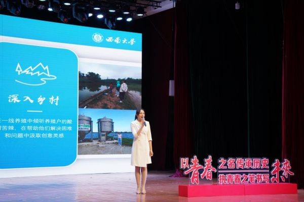 第二篇章“致青春”邀请两位高年级同学为大家讲述自己的励志故事。来自水产学院的硕士研究生陈玥瑚以《做一条奋力游动的鱼,奔向星辰大海》为题,与学弟学妹分享了自己把青春扎根在广袤的实践大地中,将小我与大我紧密相连,将个人的梦想与祖国富强和人民幸福紧密相连,力求用专业所长使更多人拥抱美好生活的奋斗历程。在梦想的牵引下,陈玥瑚把奋斗足迹串联起来,先后斩获第十三届“挑战杯”大学生创业计划竞赛国赛金奖、第七届中国国际“互联网+”大学生创新创业大赛国赛银奖、第十届“创青春”中国青年创新创业大赛铜奖,并获评重庆市优秀本科毕业生、重庆市创新能力提升先进个人等奖项。她以“中国大学生自强之星”这项全国仅有十位的殊荣为自己、为母校争得荣誉。