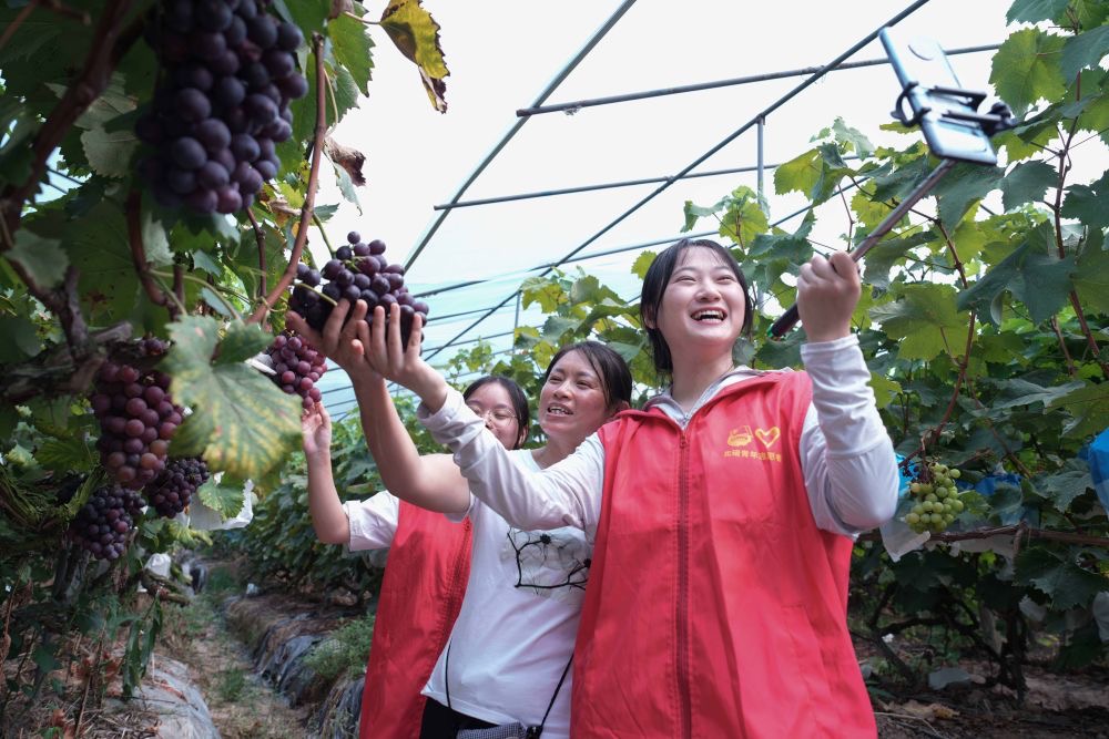 当日,共青团重庆市北碚区委组织参加“返家乡”“三下乡”社会实践活动的大学生走进葡萄园,开展“青耘重庆”直播助农活动,帮助果农拓宽销售渠道。今年暑期,共青团重庆市委联合多家单位启动了“青耘重庆”直播助农活动暨大学生公益助农营销挑战赛,组织多个高校的大学生开展为期两个多月的公益助农销售活动。连日来,大学生们来到田间地头,通过直播带货、创意视频、推文宣传等形式,扩大当地农特产品影响力和知名度。