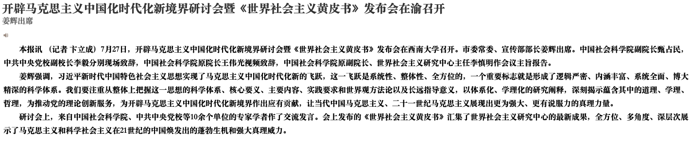 【重庆日报】开辟马克思主义中国化时代化新境界研讨会暨《世界社会主义黄皮书》发布会在渝召开
