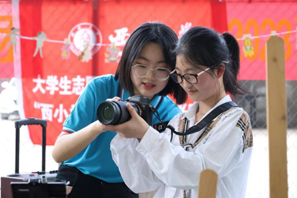 实践团队员为孩子讲解相机使用方法