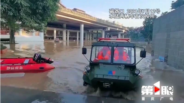 水里“水上漂”,上岸后摇身变“车”。水陆救援车两栖“通吃”,山川、丛林、台阶、废墟通通畅行无阻。地貌多样的重庆,正是它大显身手之处。