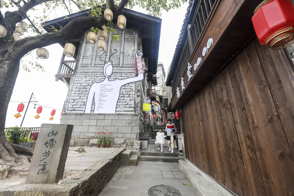 山城巷面江临崖而建,是重庆唯一一条以“山城”命名的街巷。临江的石梯步道一边是壮观的长江大桥、高耸的楼宇大厦,一派现代气象;另一边则是传统吊脚楼民居、百年宅邸老建筑,以及“摆龙门阵”的老街坊、吃着火锅看川剧变脸的游客,留住过往时光。