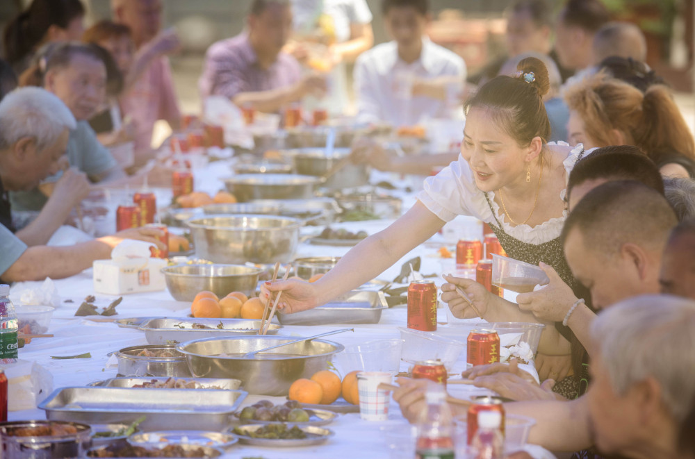 ▲6月20日,两江新区人和街道邢家桥社区,居民正在享用自己筹办的端午粽宴。记者张锦辉摄/视觉重庆