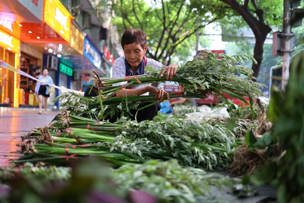 ▲6月20日,沙坪坝区石碾盘节日期间临时摊位,摊主在整理菖蒲、艾草等。端午将至,艾草菖蒲旺销。特约摄影孙凯芳/视觉重庆