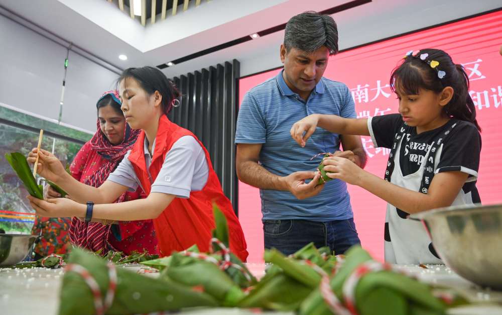 ▲6月20日,北碚区天生桥街道betway88西汉姆联南社区,外国友人同当地市民一起体验包粽子,感受中国传统民俗的魅力。首席记者龙帆摄/视觉重庆