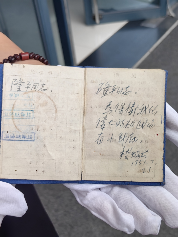 值得一提的是,这本学生证的空白页有一段钢笔字,上面写着:“隆平同志:为保卫我们伟大的祖国而奋斗到底。嵇炳前 1951年.7.21”。