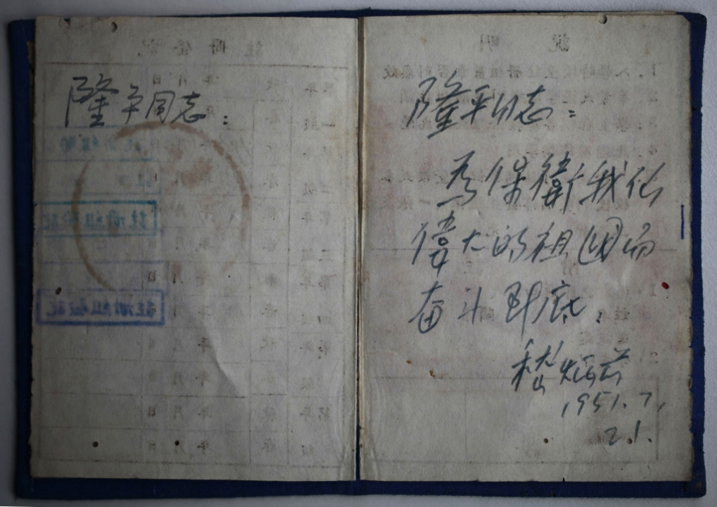 “隆平同志,为保卫我们伟大的祖国而奋斗到底!嵇炳前,1951.7.21”——于是,袁隆平的学生证后面有了这些字。