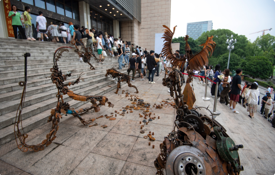 沉浸式的交互体验在本次展览中尤为突出,展示了新时代大学生在追溯传统文化和追求数字时代创新方面的独特想法。多个作品使用多元的现代性媒介、各种新型材料,充分运用空间交错、视觉动态等,呈现出丰富绚烂的视觉效果。