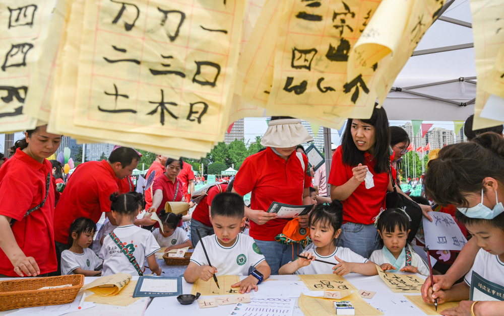 ▲5月31日,渝北区中央公园广场,学生正在体验书法。首席记者 龙帆 摄