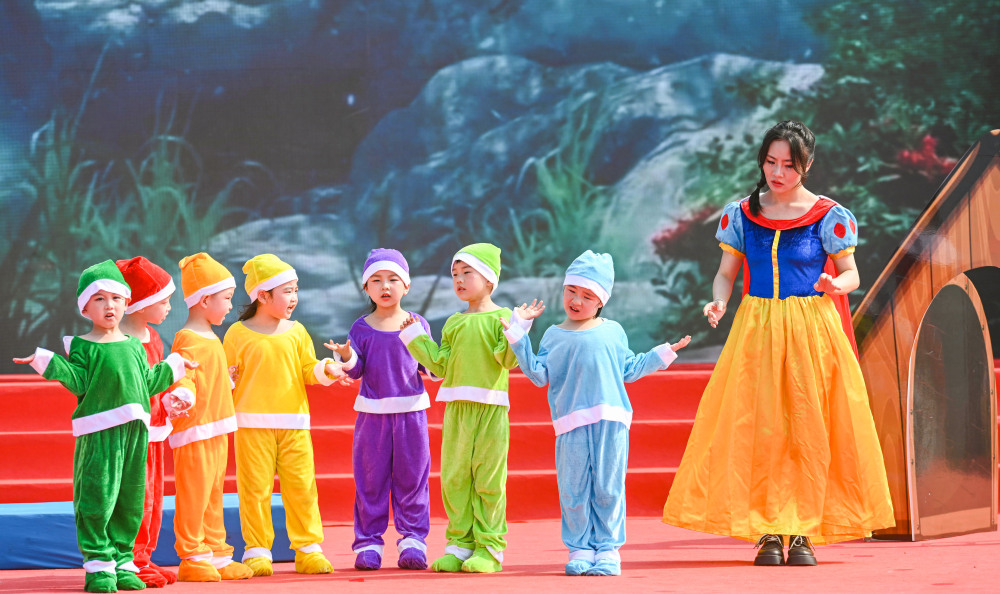 ▲5月31日,渝北区中央公园广场,小朋友和老师正在表演节目。首席记者 龙帆 摄