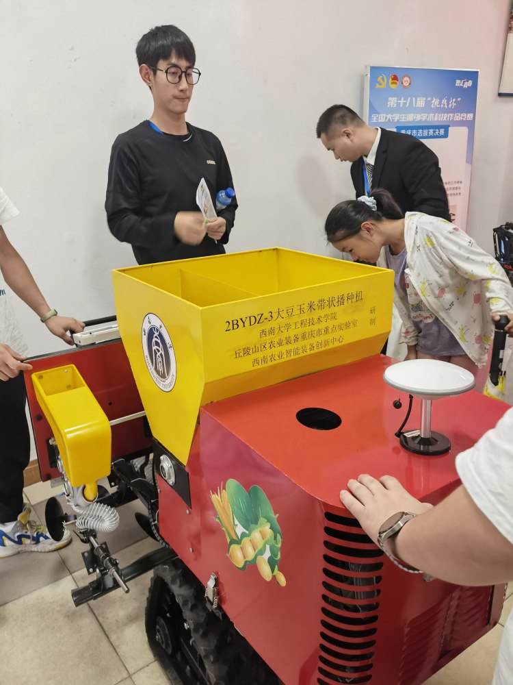 来自betway88西汉姆联机械工程专业的学生团队则带来了研发的“大豆玉米带状播种机”。这是一款集开沟、施肥、播种于一体的电控精量化播种机械,适用于丘陵山区。“它体积小、灵活度高,可以自己爬坡上坎,非常适合在西南地区推广应用。”团负责人介绍,利用该带状播种机不仅能可以做到精准施肥,还能节约不少人工成本。