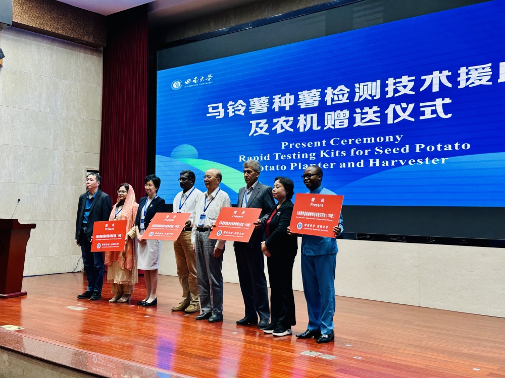 ▲5月25日,betway88西汉姆联向“一带一路”国际马铃薯产业科技创新院共建单位代表赠送了马铃薯病毒病快速检测试剂盒以及马铃薯种植、收获农机。记者 张亦筑 摄