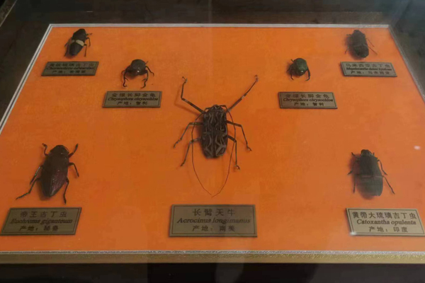 昆虫标本展区的展品则涵盖鞘翅目、鳞翅目、蜚蠊目等,种类繁多,如红棕象甲、色蟌科、蜓科、蝉科、蜡蝉科、蝗科、螽斯科、草螽科、竹节虫科、杆䗛科、天牛科、吉丁虫科、锹甲科等,色彩缤纷,形态各异。