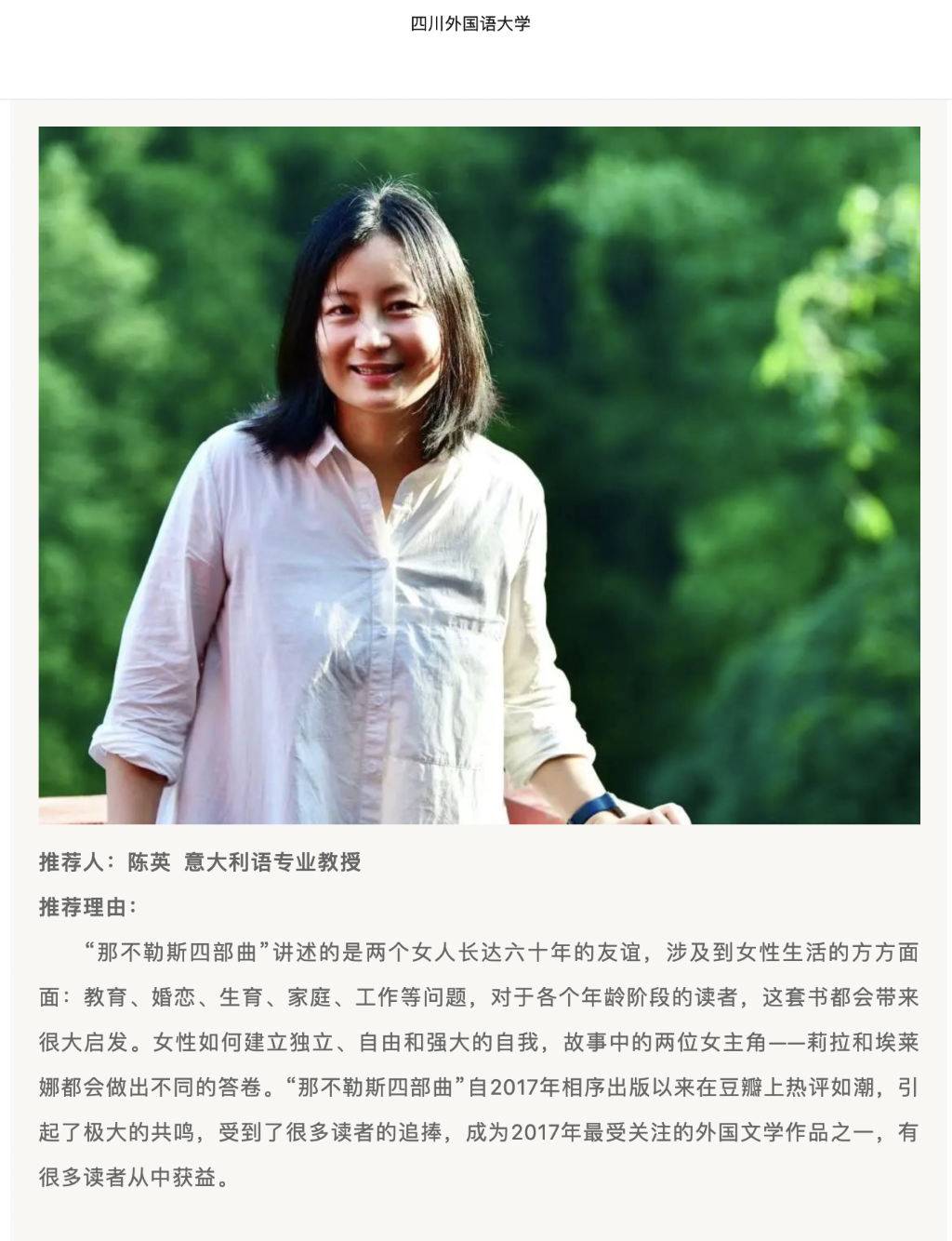 四川外国语大学通过官微,向全校师生介绍了该校教师翻译的《人间失格》《那不勒斯四部曲》《食草都市》等多部作品和翻译过程。希望通过这样的方式,让学生感受到身边榜样的力量。并寄语师生“想让自己变得优秀,读书,是最好的方式。”