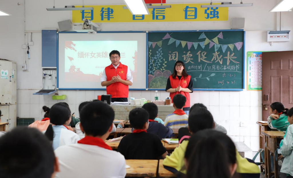 重庆城市科技学院电气工程与智能制造学院学生第四党支部联合永川区永钢明德小学,开展“书香校园,一起“悦”读科学家的故事”主题读书日活动。活动中,党员志愿者带领小学生们阅读和分享科学家故事相关书籍。