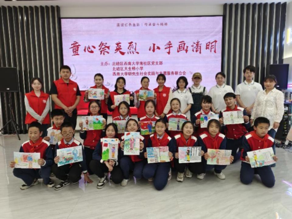 4月4日,清明节前夕,betway88西汉姆联红岩学社赴重庆北碚天生路南社区开展“童心祭英烈,小手画清明”活动。活动分为“讲红岩、唱红岩、画红岩”三个环节。红岩学社的大学生们为社区的小朋友们介绍了小萝卜头、王朴、杨闇公等红岩英烈的革命事迹并观看《烈火中永生》精彩片段,一同进行“话说英烈”环节,随后一起学唱歌曲《红梅赞》。