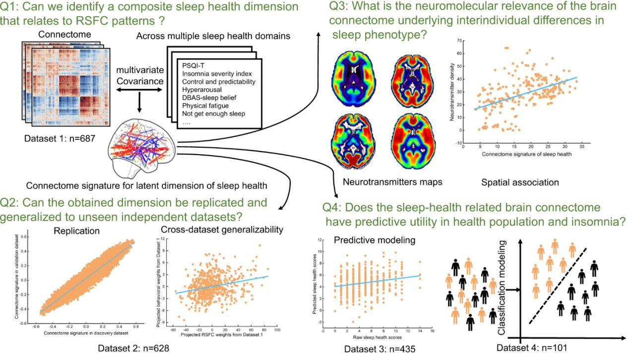睡眠不足、睡眠质量下降以及睡眠相关疾病的激增已成为一项全球性的健康挑战。研究团队首先基于中国人的人格——行为——脑研究项目的大样本(N=687)作为探索数据集,采用多变量机器学习方法,将睡眠健康的多维度和静息态功能连接进行关联分析,得到刻画睡眠健康的主要脑网络功能连接模式。该工作的一个创新点是囊括了一系列广义上的睡眠健康指标,共有36个特征,并被进一步划分到七个维度:睡眠的主观满意度、清醒状态下的警觉性、睡眠的早晚时段偏好、睡眠时长、睡眠缺乏的症状,以及睡眠信念、态度和习惯。从四大研究问题入手,层层递进以最终确定睡眠健康的脑网络标志物。