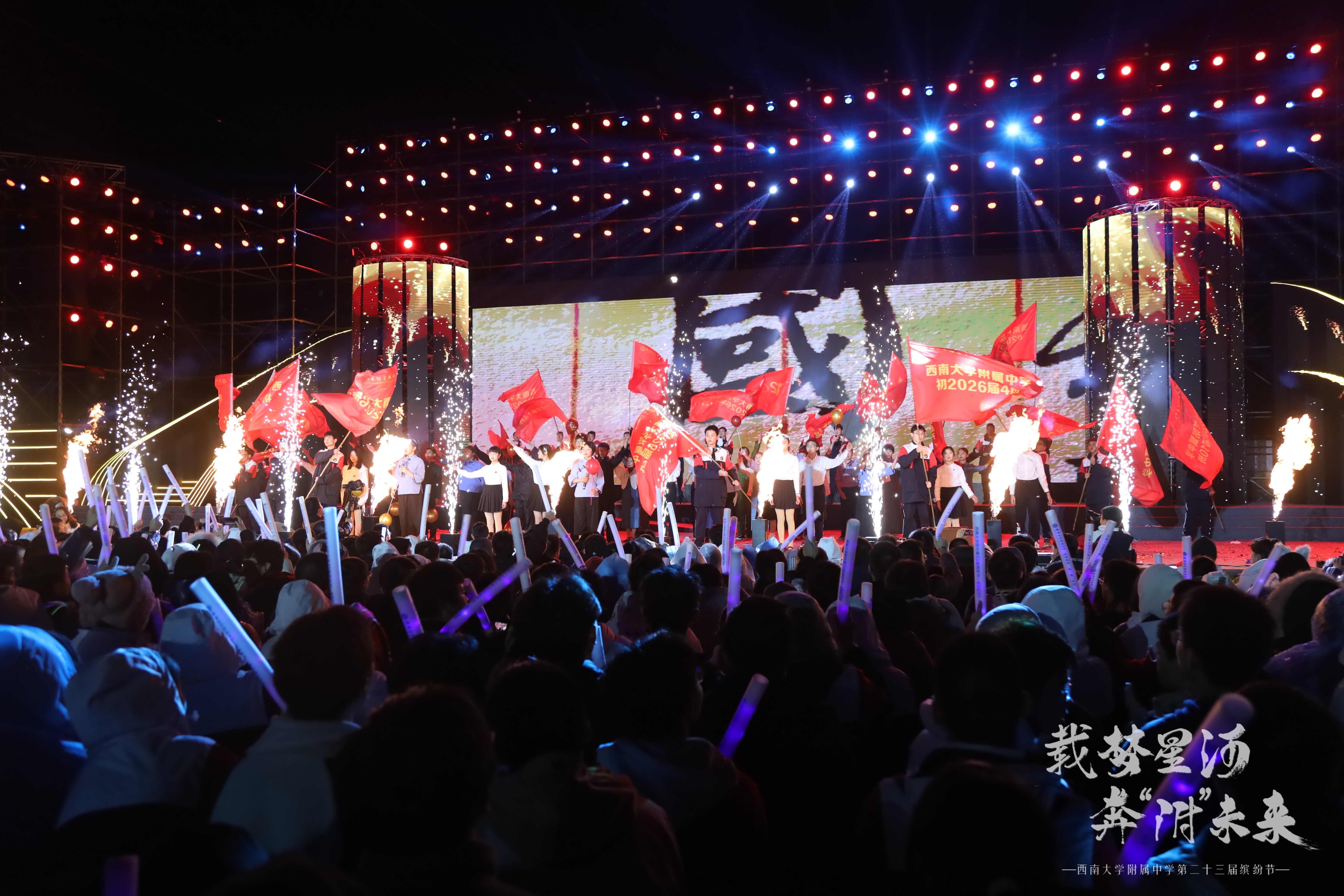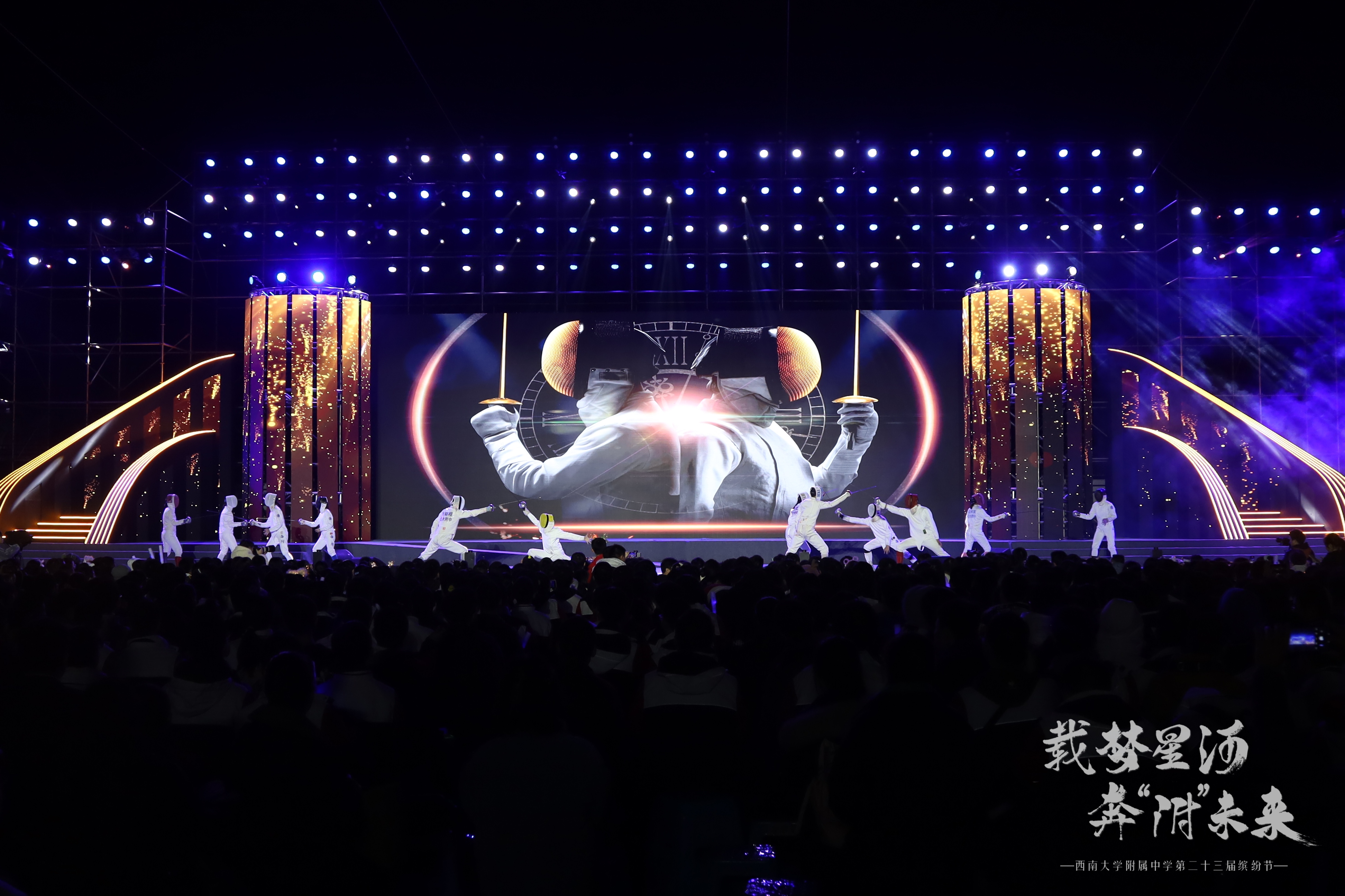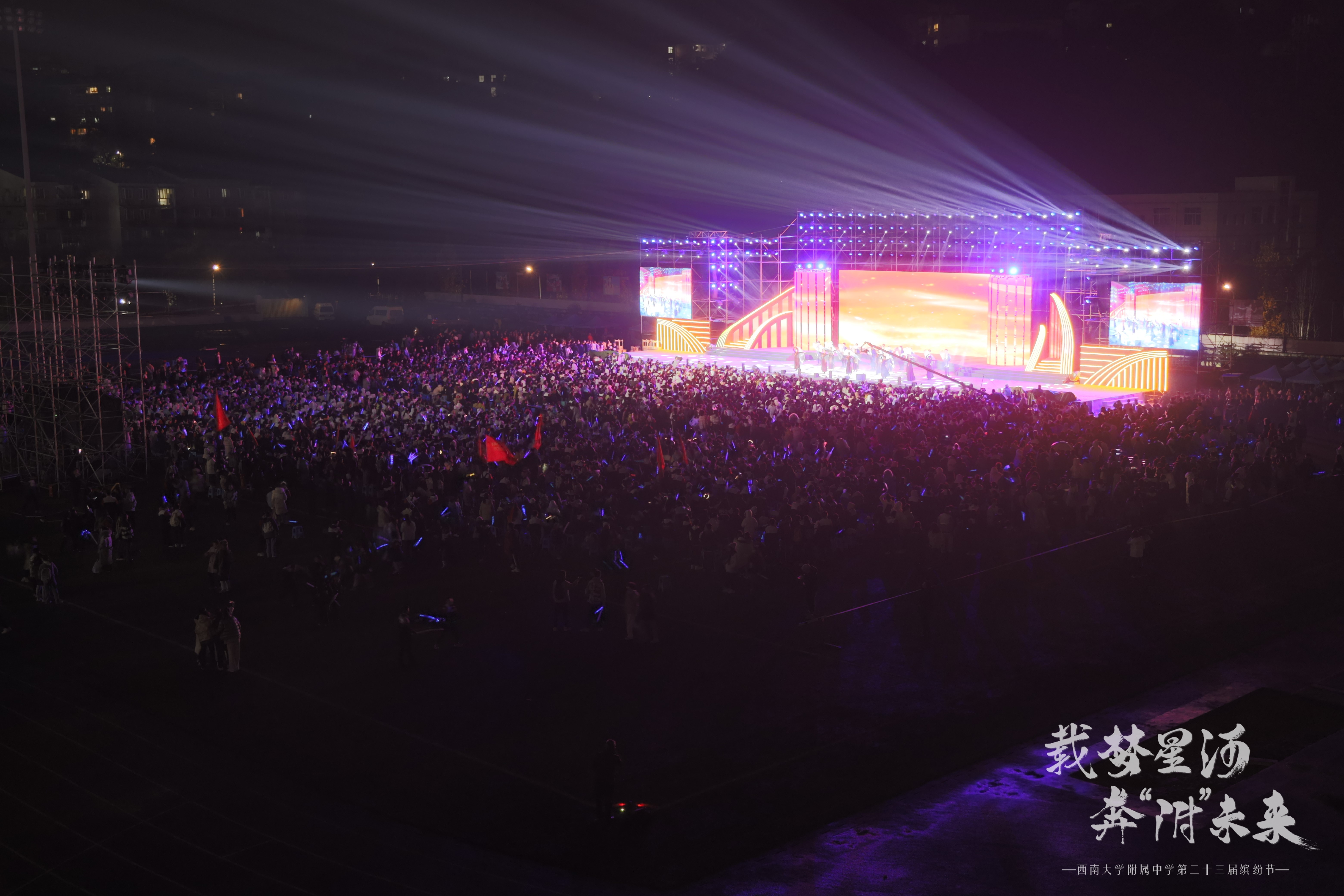 本部操场举行。晚会舞台变幻灵动、流光溢彩,点亮了属于学生们的夜空。