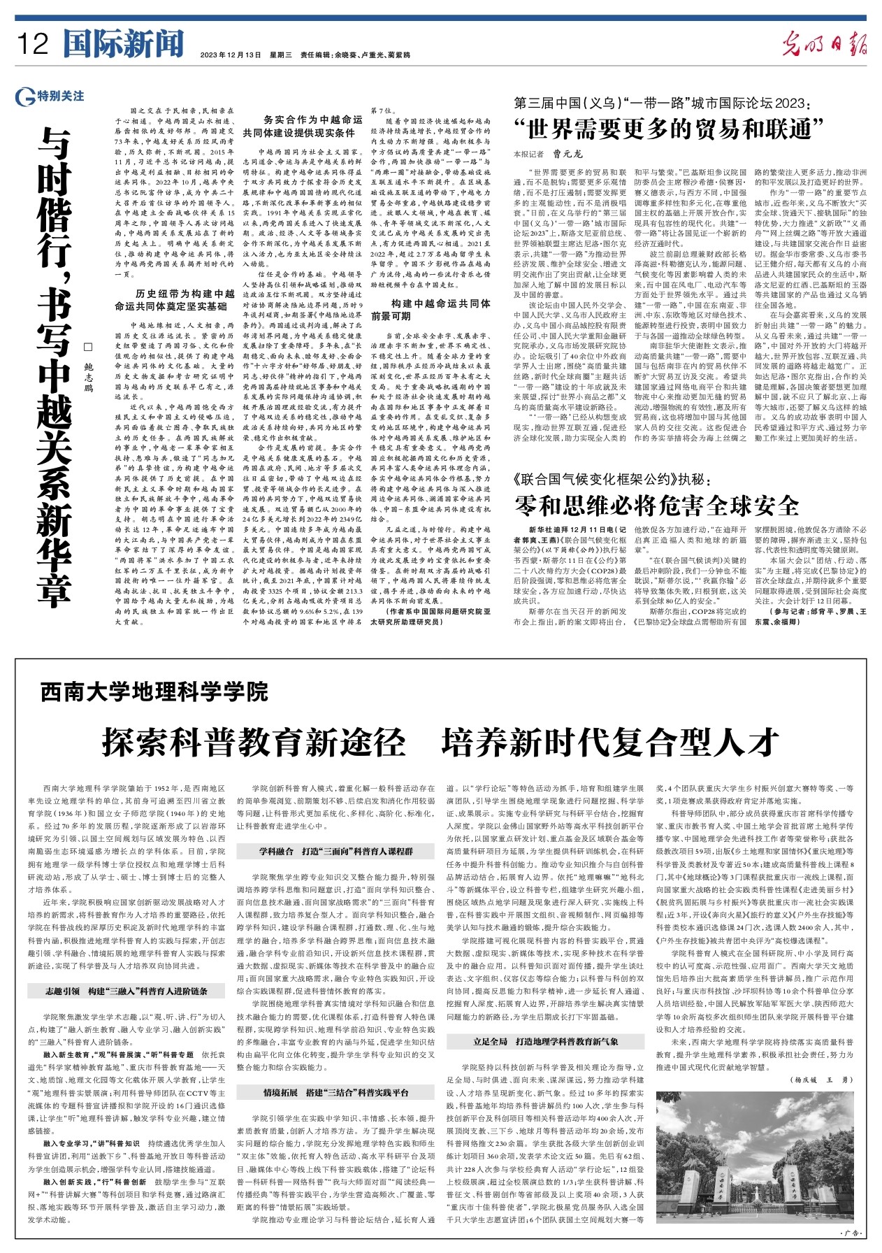 学院推动专业理论学习与科普论坛结合,延长育人通道。以“学行论坛”等特色活动为抓手,培育和组建学生展演团队,引导学生围绕地理学现象进行问题挖掘、科学举证、成果展示。实施专业科学研究与科研平台结合,挖掘育人深度。学院以金佛山国家野外站等高水平科技创新平台为依托,以国家重点研发计划、重点基金及区域联合基金等高质量科研项目为延展,为学生提供科研训练机会,在科研任务中提升科普科创能力。推动专业知识推介与自创科普品牌活动结合,拓展育人边界。依托“地理嘛嘛”“地科北斗”等新媒体平台,设立科普专栏,组建学生研究兴趣小组,围绕区域热点地学问题及现象进行深入研究、实施线上科普,在科普实践中开展图文组织、音视频制作、网页编排等美学认知与技术融通的锻炼,提升综合实践能力。