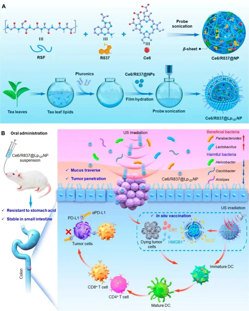超声处理产生大量单线态氧,引起结直肠肿瘤细胞免疫原性死亡,释放肿瘤自身抗原,在R837的存在下,生成原位肿瘤疫苗。进一步的研究表明,该口服药物系统联合免疫检查点阻断剂(αPD-L1),不仅可以抑制原位肿瘤生长,还可以根除远端肿瘤,并调节肠道菌群平衡。