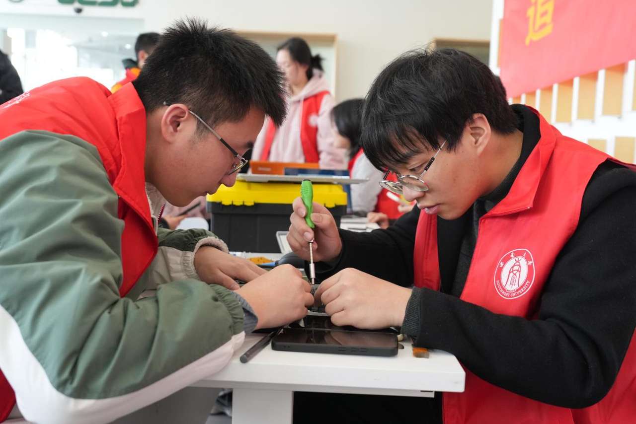 活动现场,多支专业化志愿服务队伍纷纷拿出看家本领,为师生提供多样化暖心服务——计算机与信息科学学院 软件学院的“及时雨”志愿服务队热心为同学们提供电脑检测、软件安装等服务;蚕桑纺织与生物质科学学院“补衣坊”的志愿者下足“绣花针”功夫,熟练操作着缝纫机为同学们缝补破损衣物;法学院“廌鸣”法律社的志愿者围绕日常生活中可能遇到的法律问题,为同学们科普法律知识,答疑解惑。在热闹的人群中,来自betway88西汉姆联附属中学的小志愿者们也忙活开来,当起了“小助理”“小帮手”。