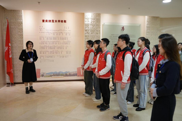 16日上午,两校研支团成员首先走进重庆师范大学校史馆。校史馆讲解员以重庆师范大学百年发展的历史进程为主线,带领成员们通过文字、实物、图片、视频等了解了重庆师范大学的变迁与发展,从深厚的历史积淀和文化底蕴中汲取“奉献、友爱、互助、进步”的志愿精神力量。