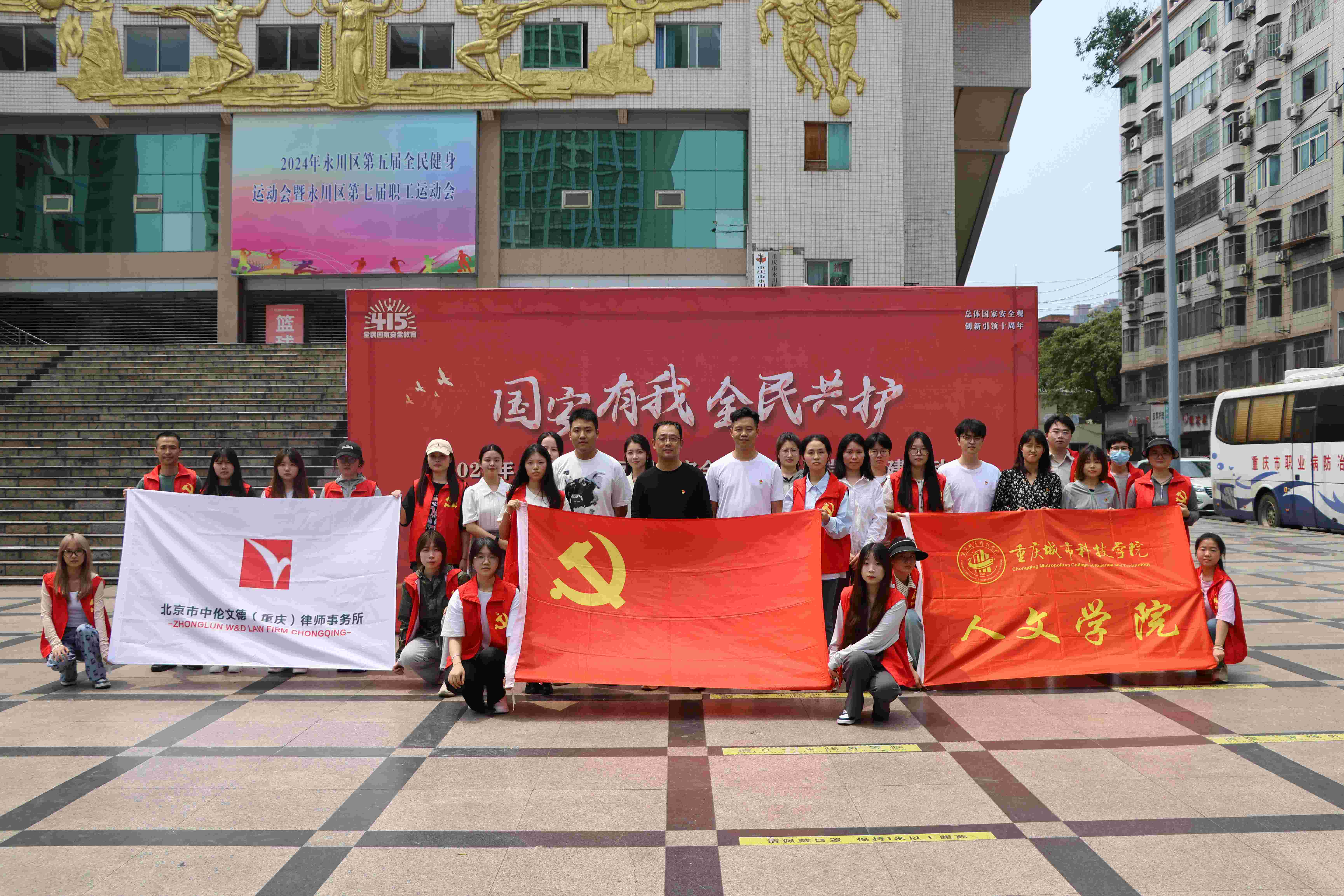 15日上午,在永川区棠城体育馆前广场,由重庆城市科技学院人文学院学生第二党支部联合北京市中伦文德(重庆)律师事务所共同举办的“4.15”国家安全教育日暨法律进社区普法宣传活动吸引了不少市民参与。通过发放宣传材料、解答群众咨询、趣味有奖竞答等多种方式,师生志愿者和专业律师向广大群众积极宣传国家安全相关法律法规。
