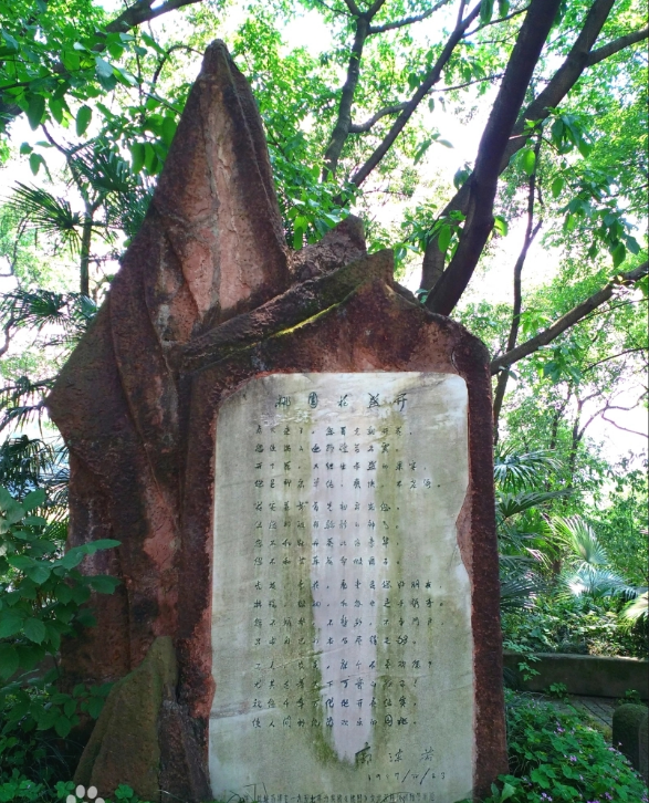 1957年,学校响应毛主席提出的“百花齐放,百家争鸣”的“双百”方针,文艺创作活动空前繁荣。当时的西师中文系学生们创办了一本文学刊物《桃园》,想请一些社会名流题词,怀着忐忑的心情给他们写去了信件,其中一封寄给了大名鼎鼎的中国科学院院长、著名文学家、历史学家郭沫若先生。信是交出去了,能否如愿,大家其实心中没底。没想到,只过了一周多时间,郭老的回信就由中国科学院院长办公室用航空邮件寄来了。大家迫不及待地拆开邮件,不但看到了郭老亲笔为《桃园》杂志题写的刊名,尤其令人惊喜不已的,还有一首郭老的赠诗。后来,为了纪念郭老的这段往事,学校刻下一块诗碑,安放在图书馆的平台上,这首诗的题目叫《桃园花盛开》——
