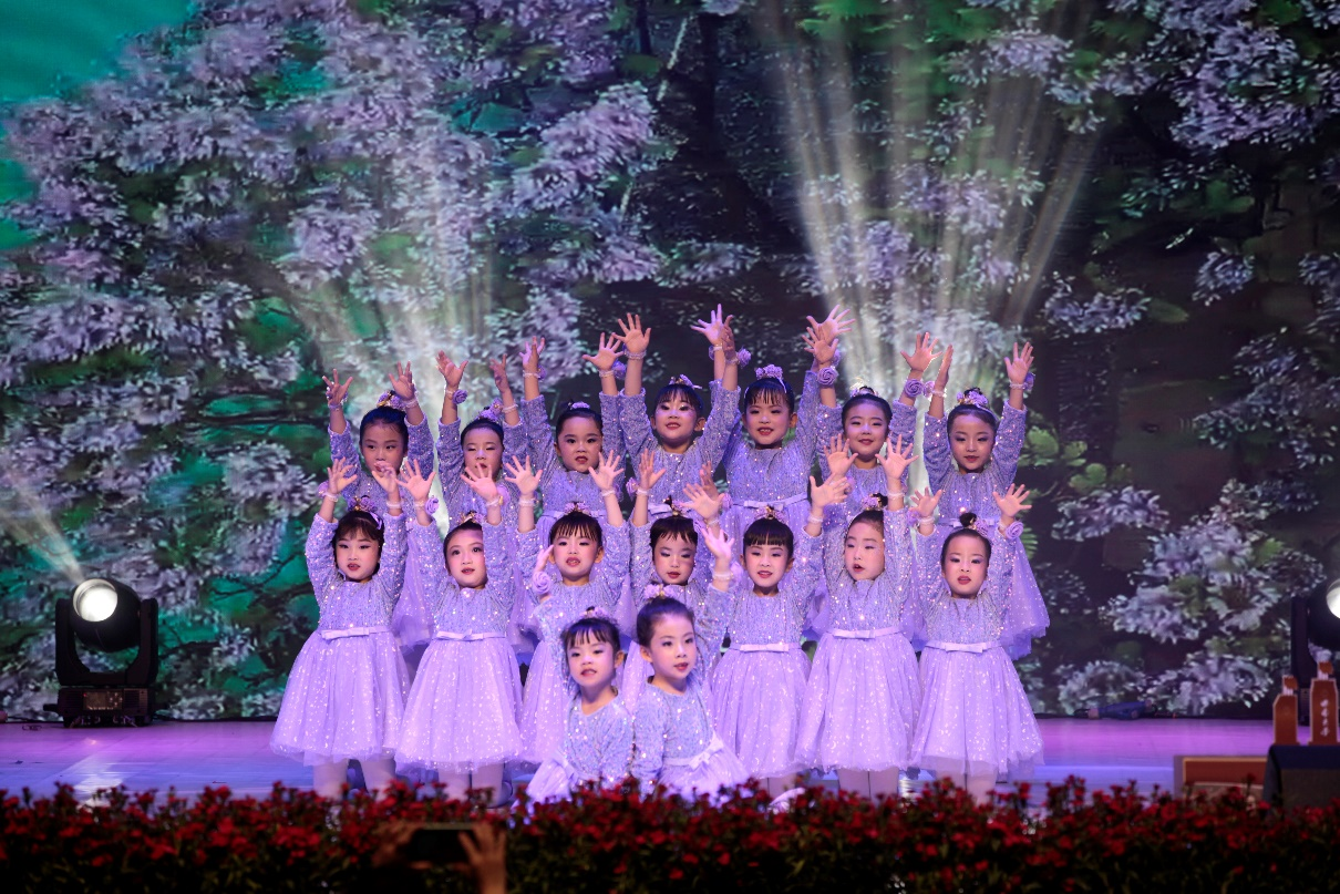 幼儿园小朋友表演原创儿童歌舞《可爱的蓝花楹》。