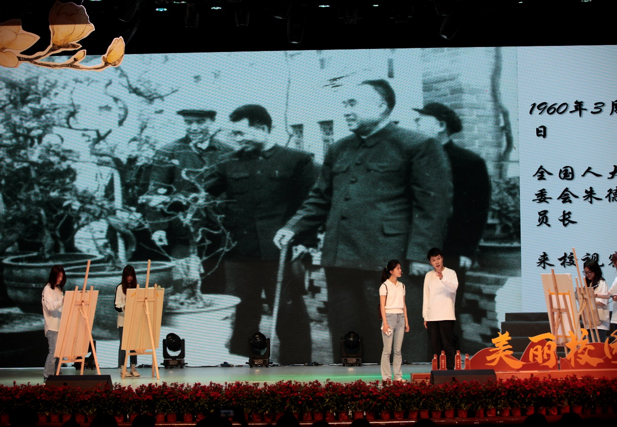 “朱德委员长来到咱们学校是1960年3月7日,正好春暖花开。当时的葡萄架下,摆着很多兰花,朱德同志向来最喜欢兰花,他一边参观一边对周边的师生们说:‘兰花质朴纯洁,不以艳丽夺人、永葆自己的本色!’”校史宣讲团的同学展示一张老照片,亲切地讲述。