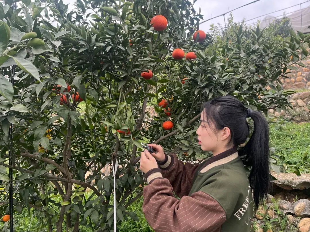 图为张丽君测量柑橘叶片SPAD值,李栋 摄
