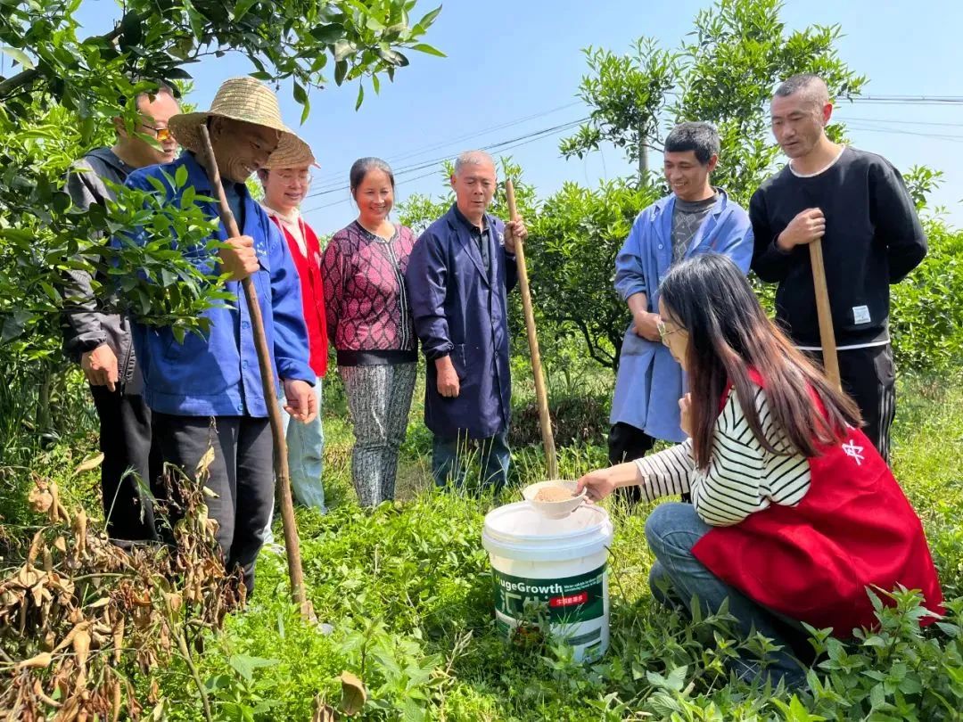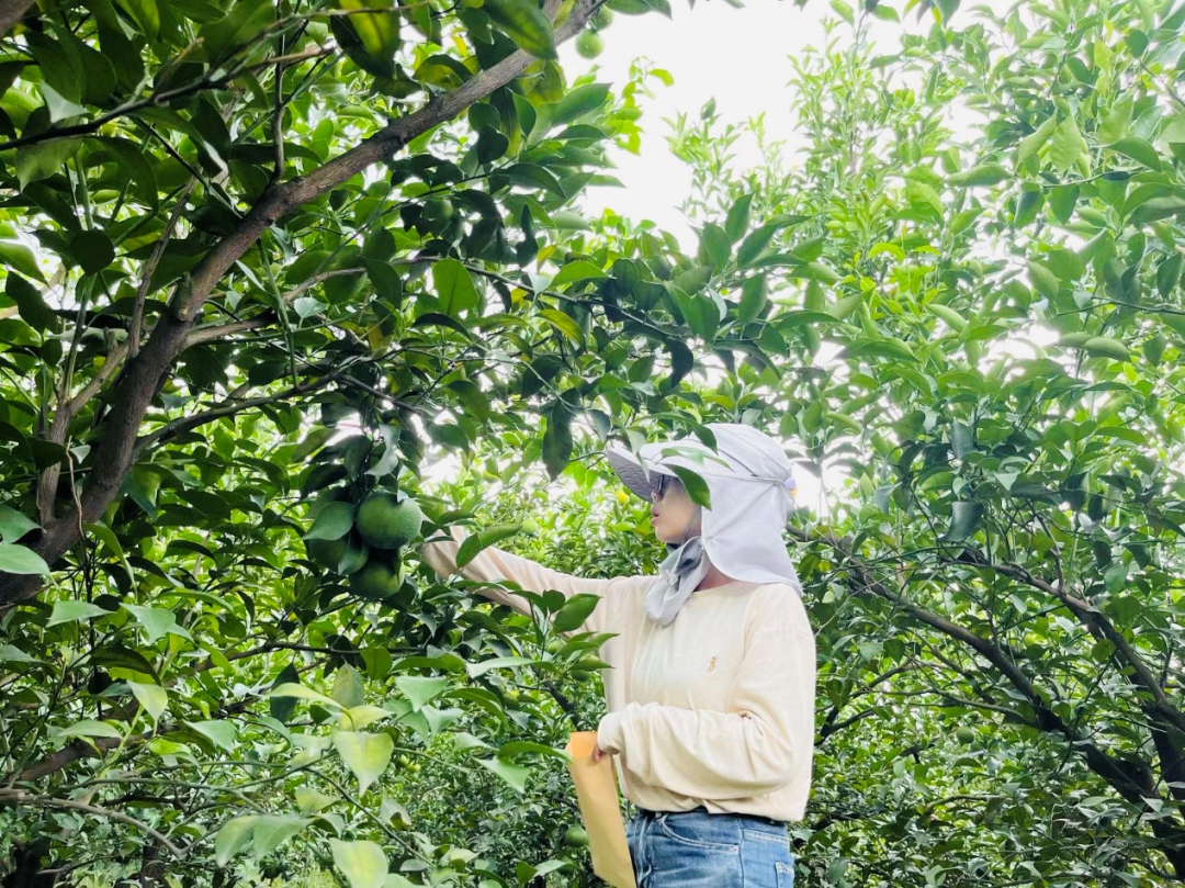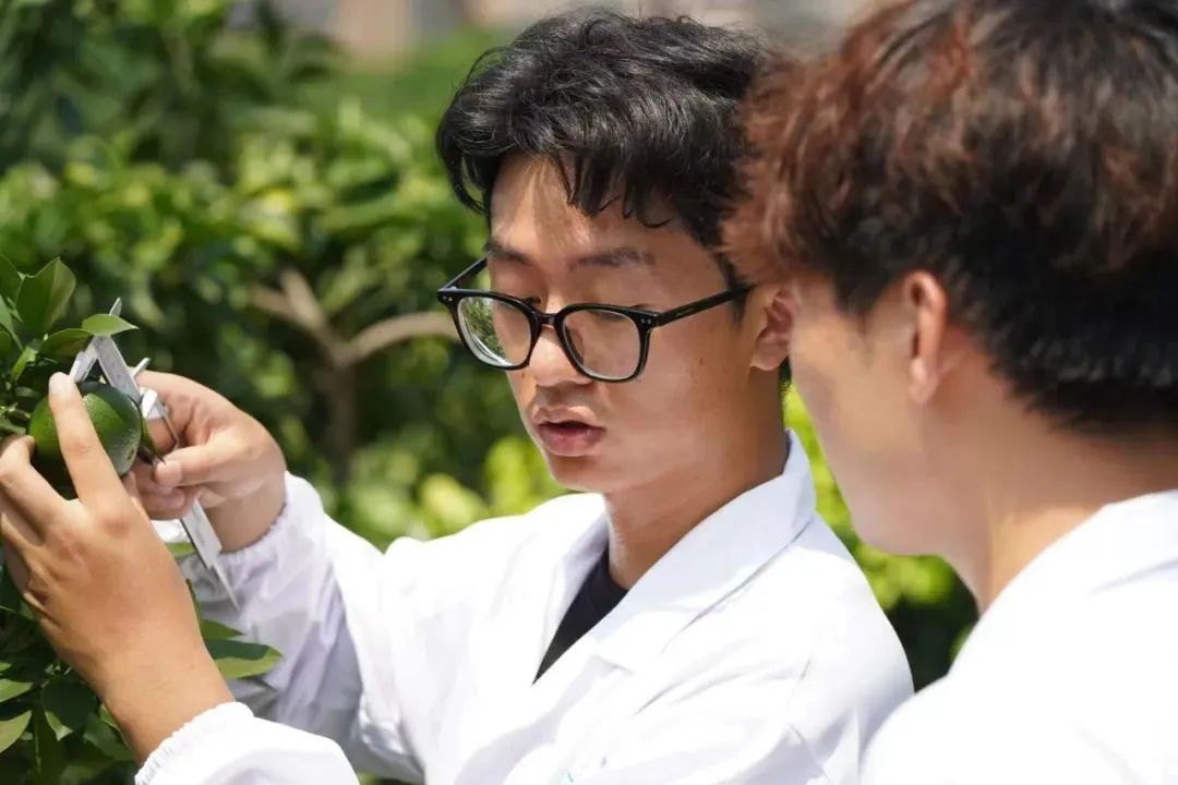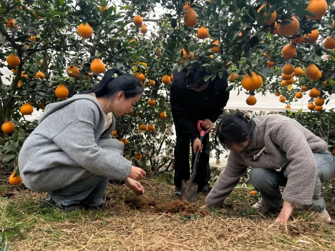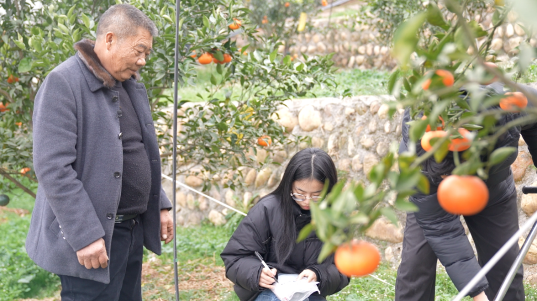 图为果农赵泽如带着科技小院学生张丽君(中)在田间研究,赵烨 摄
