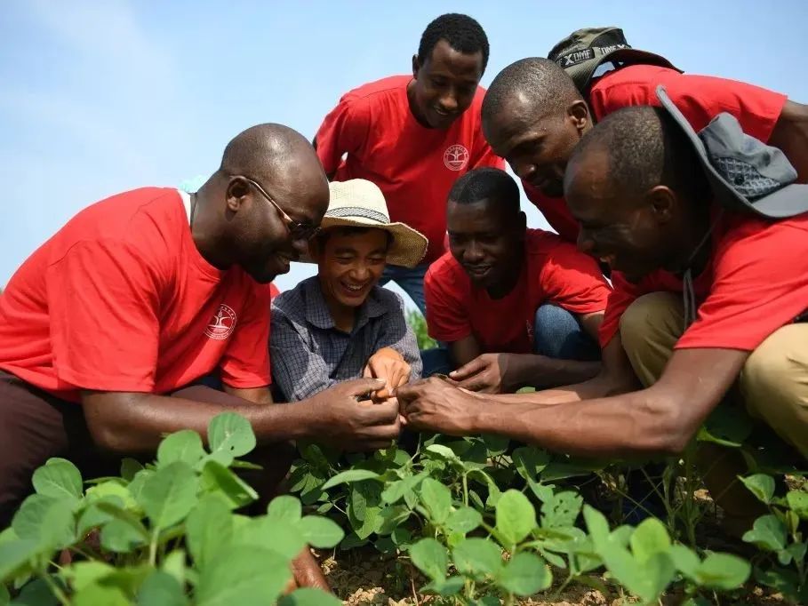图为非洲留学生在河北曲周向当地农民学习大豆种植技术
