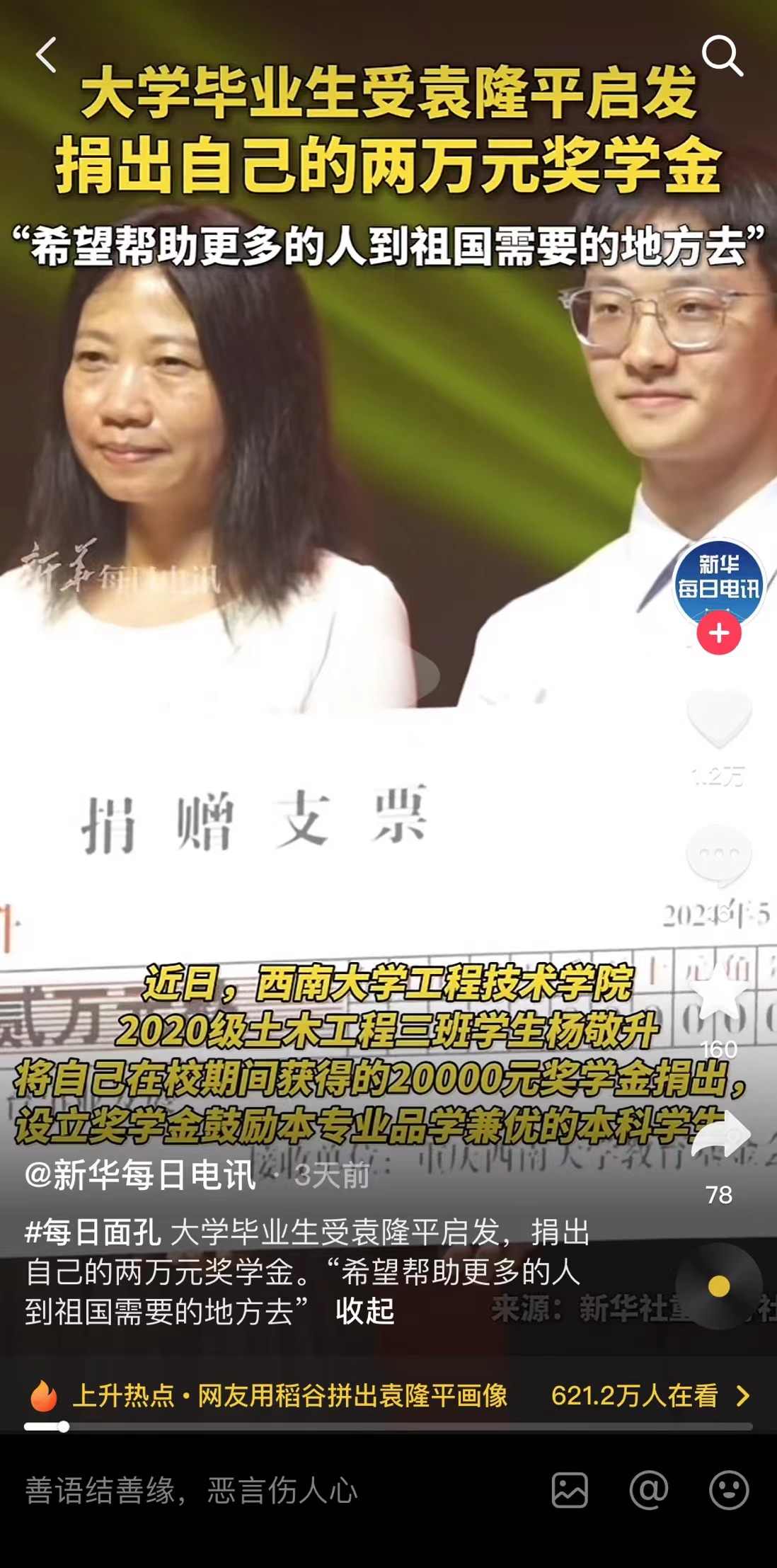 【新华每日电讯】大学毕业生受袁隆平启发,捐出自己的两万元奖学金。