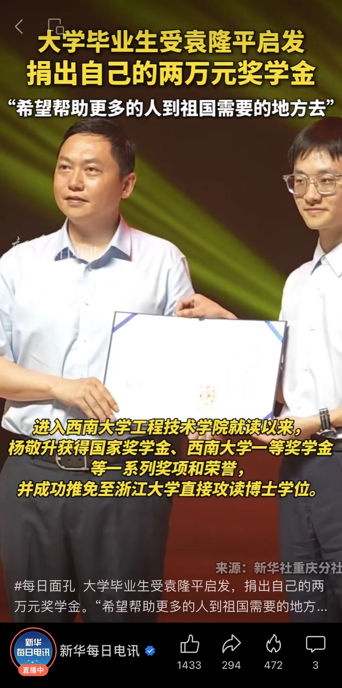 【新华每日电讯】大学毕业生受袁隆平启发,捐出自己的两万元奖学金。“希望帮助更多的人到祖国需要的地方去”