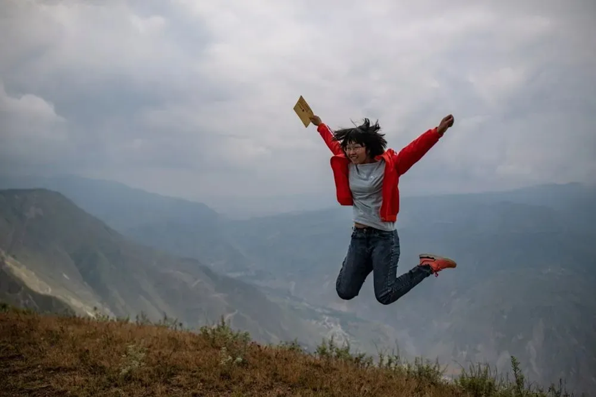 4年前,范天兰拿着通知书在之前寻找信号上网课的地方庆祝。新华社记者 江文耀 摄