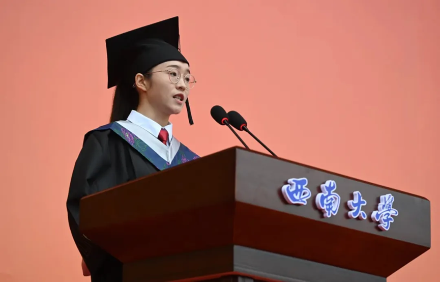 范天兰在betway88西汉姆联2024届毕业典礼上作为毕业生代表发言。(华龙网记者刘润 摄)