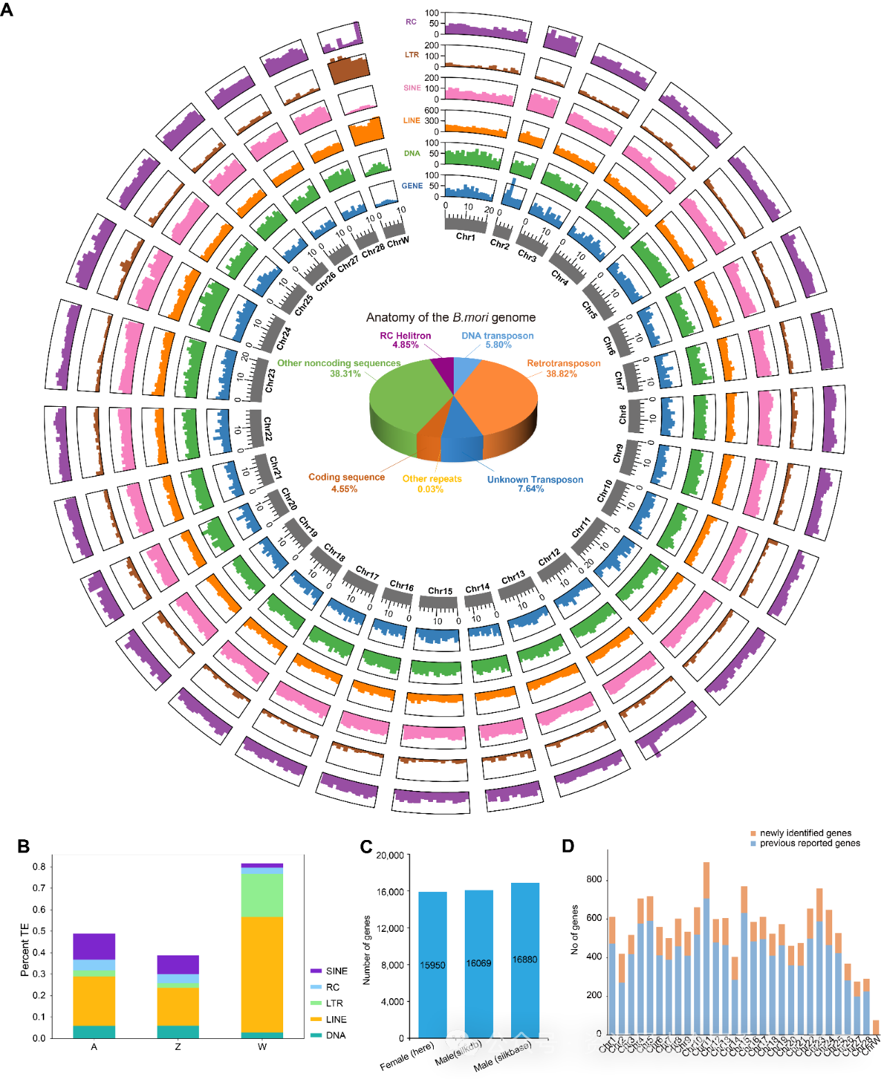 家蚕不同染色体重复序列、蛋白编码基因分布。受访者供图