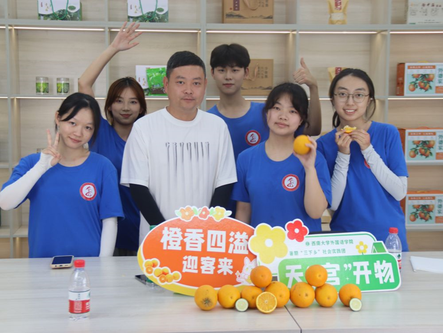 骄阳下,社会实践小分队深入橘林,帮助果农疏果修枝,并通过搭建线上直播平台,介绍天宫村柑橘品种与乡村发展情况,助力当地特色柑橘销售。在天宫村养老服务中心,小分队成员还帮助老人们打扫清洁,并带来了精彩的文艺表演及趣味游戏。