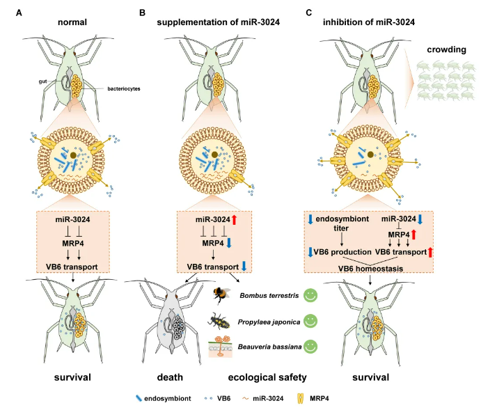 研究人员通过进一步研究发现miR-3024调控由共生菌产生的维生素B6向宿主转运的分子机制,创新性地将共生微生物与宿主蚜虫间的营养互作通过miRNA这个“分子桥梁”连接起来,提出“miRNA-MRP4-维生素B6”分子调控通路,并系统评估靶向该通路的控蚜潜力。