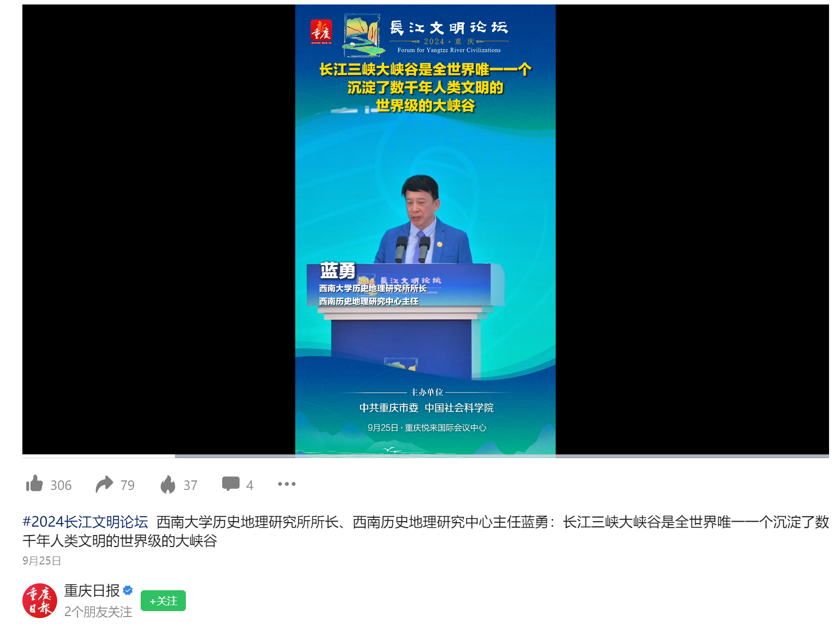 【重庆日报】betway88西汉姆联历史地理研究所所长、西南历史地理研究中心主任蓝勇:长江三峡大峡谷是全世界唯一一个沉淀了数千年人类文明的世界级的大峡谷