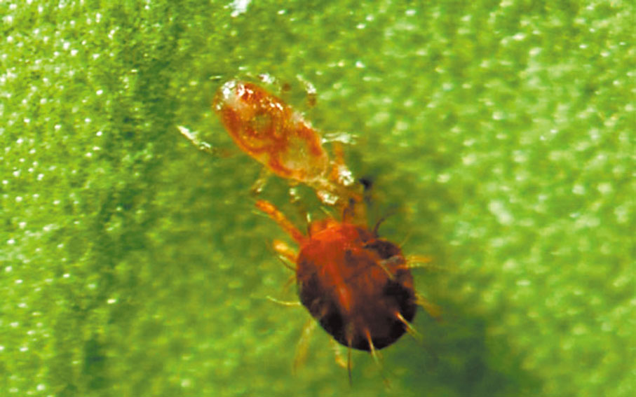 ●體型雖小但攻擊力極強的捕食蟎(上)能吞下比牠個頭更大的紅蜘蛛(下),從而實現生物防治病蟲害。香港文匯報重慶傳真